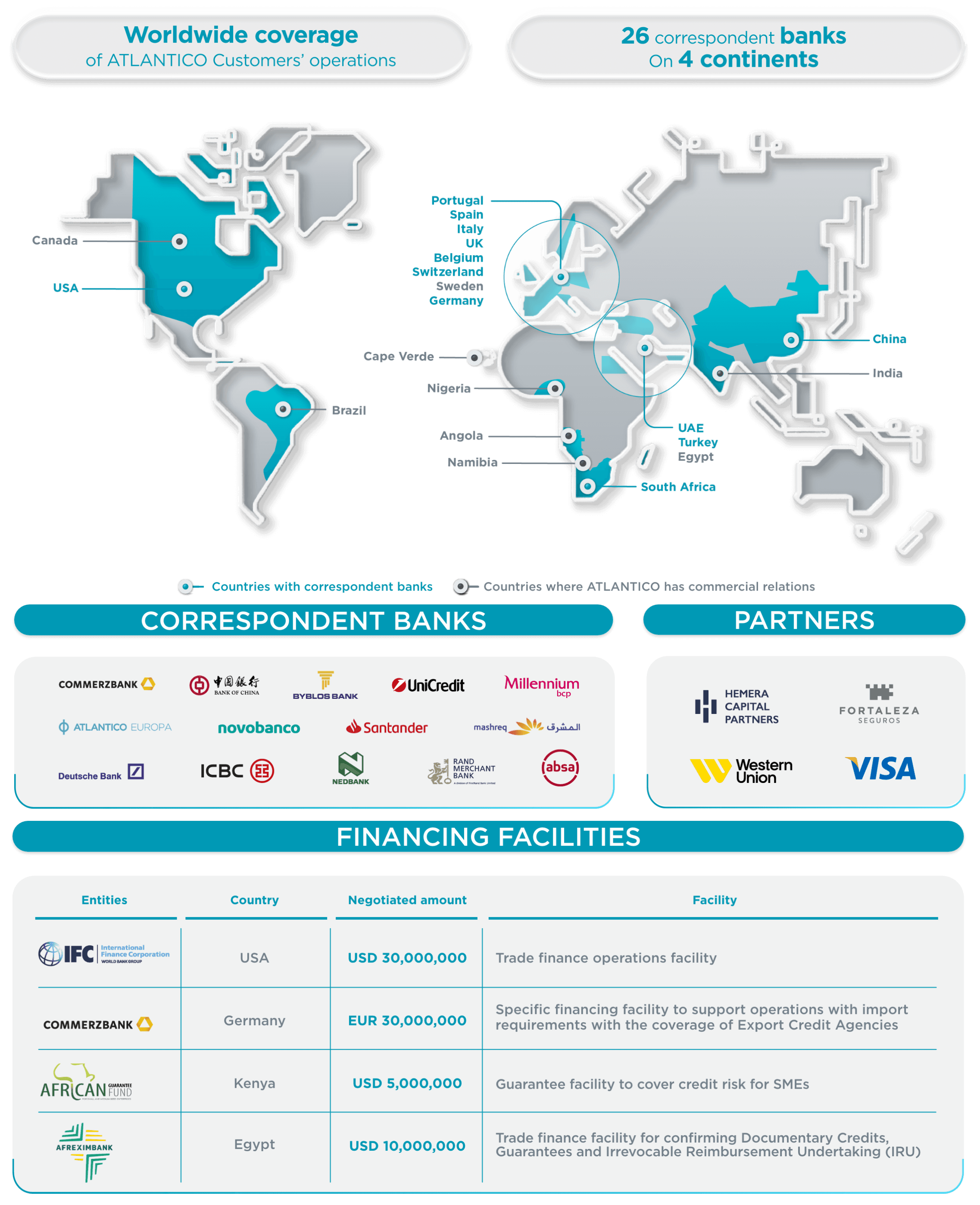 In terms of international relations, ATLANTICO has focused on strengthening its correspondent banking network, which currently has 125 institutions (26 of which have active relationships).