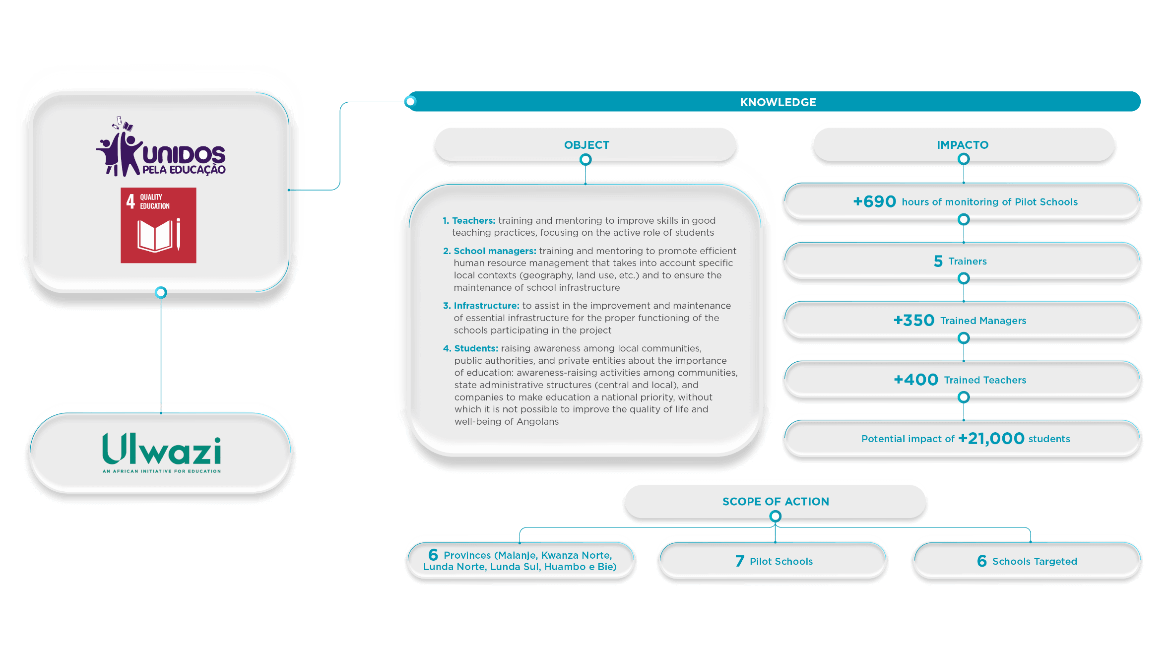 United for Education Project – aims to improve the quality of primary education in Angola by training teachers and school managers, promoting student-centred teaching methodologies, and strengthening the connection between schools and local communities. The project operates in the provinces of Malanje, Kwanza Norte, Lunda Norte, Lunda Sul, Huambo, and Bié.
