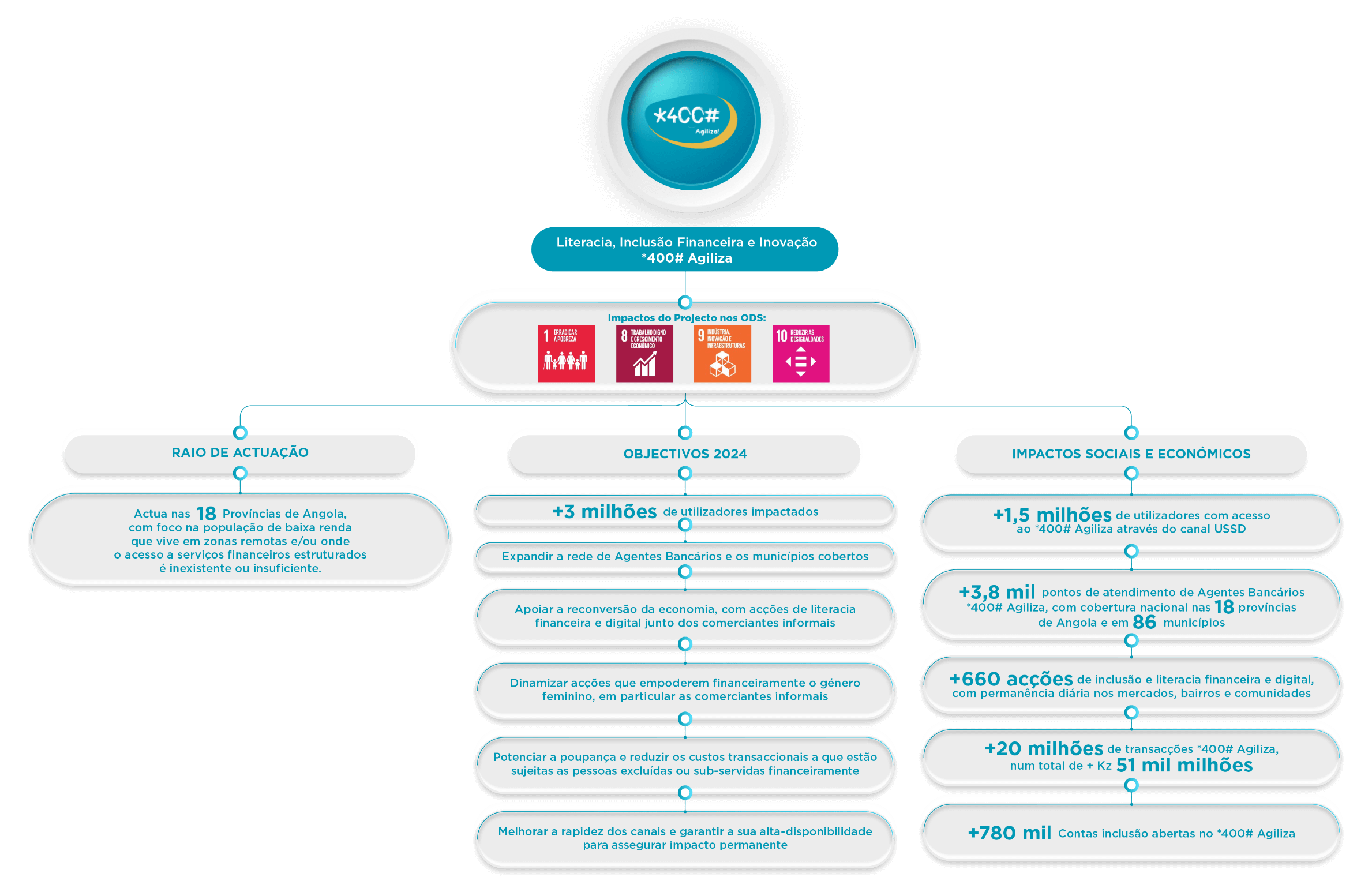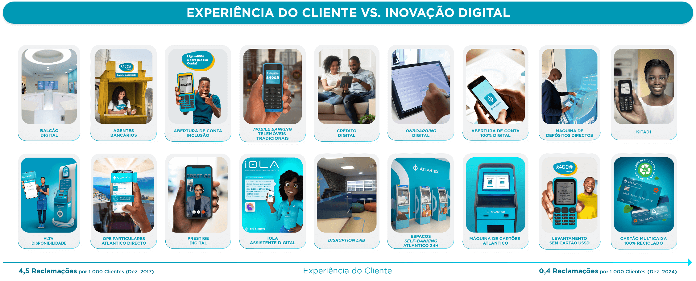 Literacia, Inclusão Financeira e Inovação – *400# Agiliza: É a plataforma do ATLANTICO para a criação de valor e prosperidade através da literacia e inclusão financeira. Com o mote, "O teu telemóvel é o teu Banco", o *400# Agiliza coloca o potencial financeiro na mão da população, com particular impacto nas famílias de baixa renda que vivem em zonas remotas e/ou em regiões onde o acesso a serviços financeiros estruturados é limitado ou inexistente.