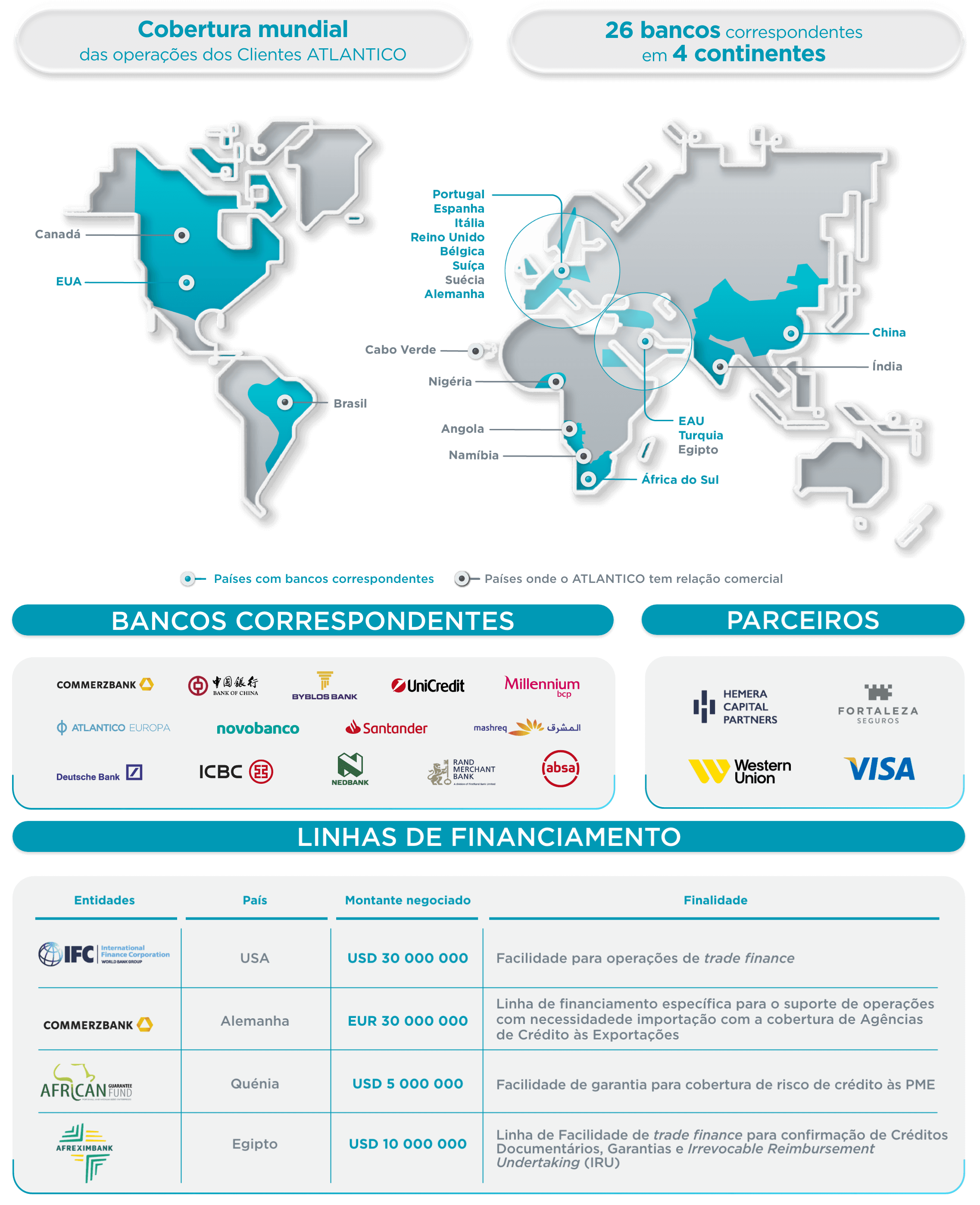 No contexto do plano estratégico PHIT 2.4, o ATLANTICO manteve o foco na consolidação das linhas de financiamento externo. Também tem reforçado as suas linhas de crédito, fundamentais para apoiar operações de trade finance e tesouraria, com o objectivo de fortalecer a sua posição nos mercados nacional e internacional. Além disso, ao facilitar o acesso aos mercados externos, contribui activamente para a industrialização do País. Na vertente das relações internacionais, o ATLANTICO tem-se concentrado no fortalecimento da sua rede de correspondentes bancários, que conta actualmente com 125 instituições (26 das quais com relações activas).