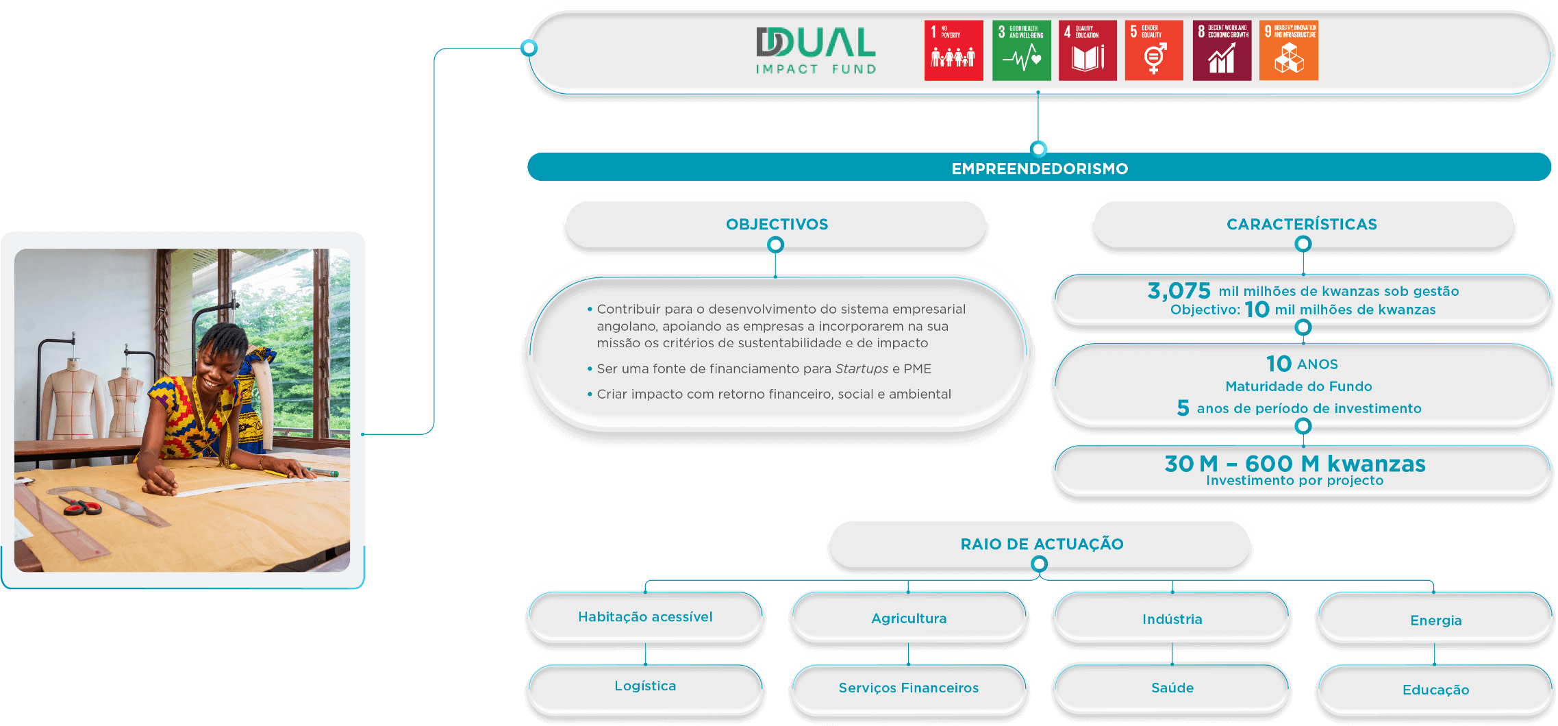 Dual Impact Fund: em parceria com a Hemera Capital Partners, o ATLANTICO é o investidor inicial do Dual Impact Fund, o primeiro fundo de Impacto em Angola. Trata-se de um veículo especializado para apoio a startups e PME que tem como foco de investimento projectos que ofereçam potencial de retorno financeiro aliado à resolução de problemas sociais.