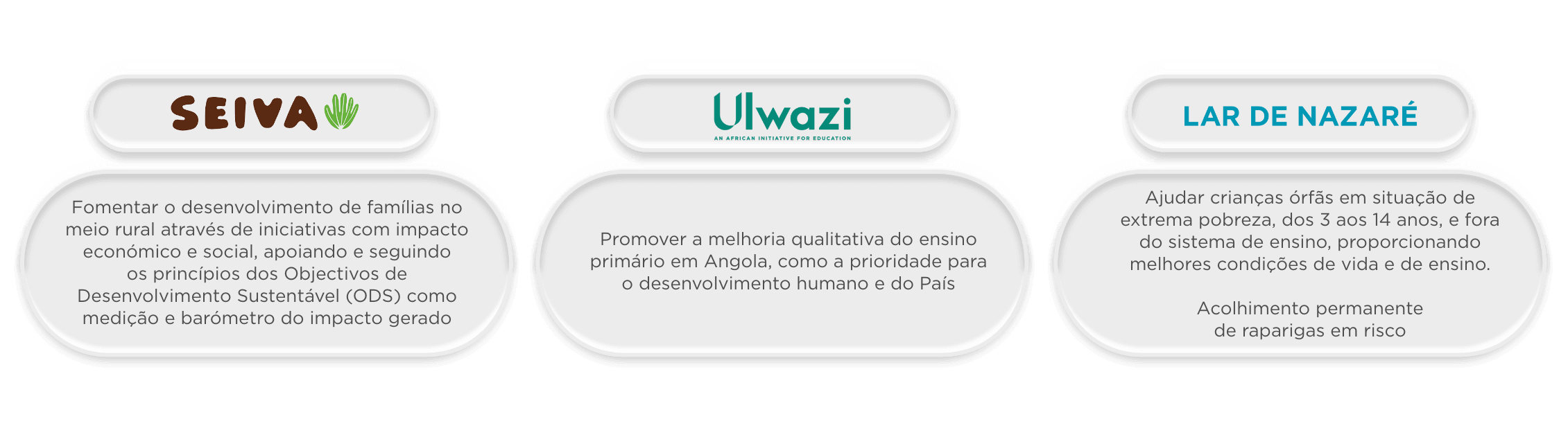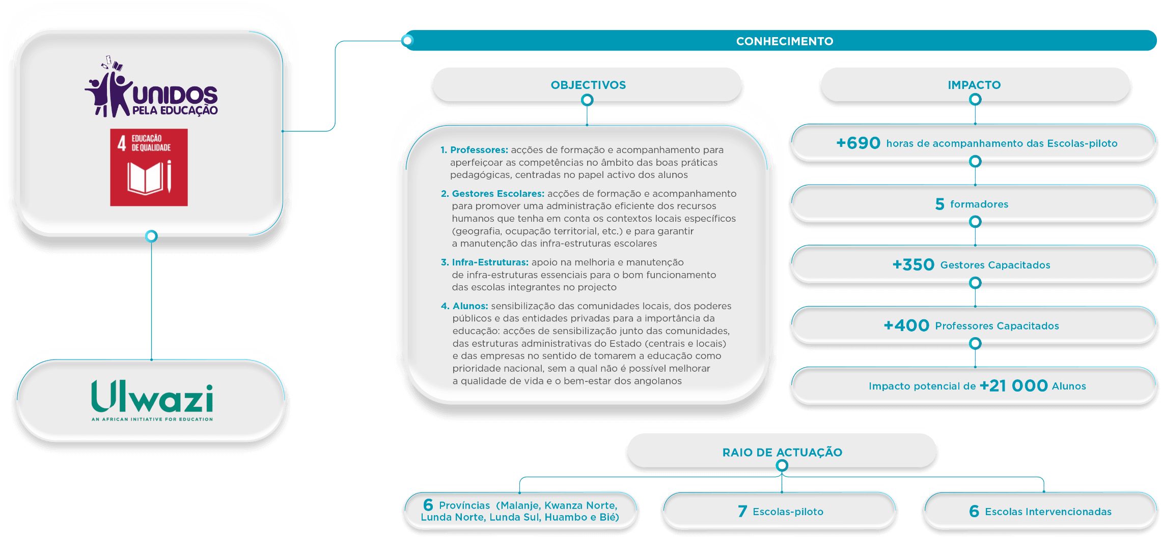 Projecto Unidos pela Educação: visa melhorar a qualidade do ensino primário em Angola através da capacitação de professores e gestores escolares, promoção de metodologias de ensino centradas no aluno e reforço da ligação entre as escolas e as comunidades locais. O projecto actua nas províncias de Malanje, Kwanza Norte, Lunda Norte, Lunda Sul, Huambo e Bié.